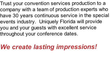 The Uniquely Florida Destination Management Team is based in the the Orlando Metro area and regularly services the Miami, Fort Lauderdale, Tampa, Naples and Key West Florida Conventions And Meetings Industry with high quality convention and meeting services. We know meeting production in the USA!..